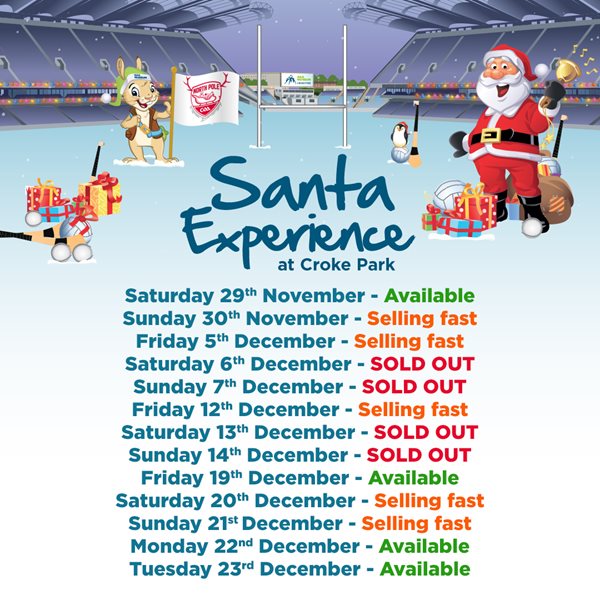 Santa will arrive at Croke Park on Saturday November 29th and the Santa Experience will run on selected dates until Tuesday December 23rd. The experience lasts 50 minutes and is wheelchair and buggy accessible. Free parking is available outside the GAA Museum, which is located on the Cusack Stand side of Croke Park.