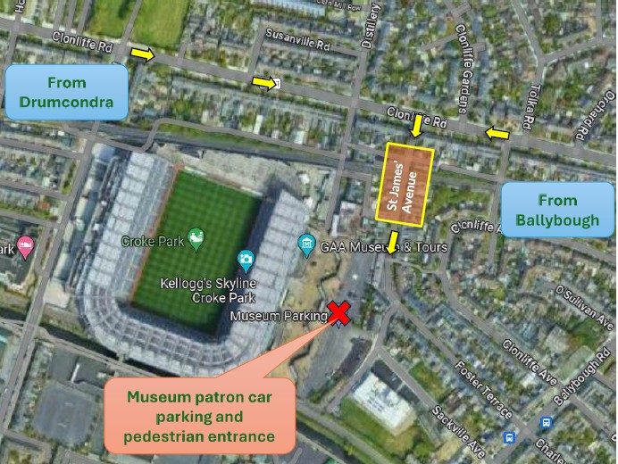 - Pedestrian access is also available through the A10 gate on St Joseph’s Avenue, off Clonliffe road.